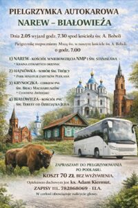 - Dnia 2 maja sprzed kościoła Św. Andrzeja Boboli wyjeżdża pielgrzymka do Białowieży przez Narew, Hajnówkę, Krynoczkę. Odjazd autokaru godz. 7:30. Koszt 70 zł., zapisy pod numerem tel. 782868069.